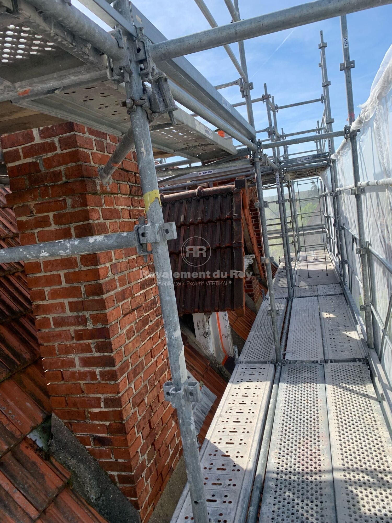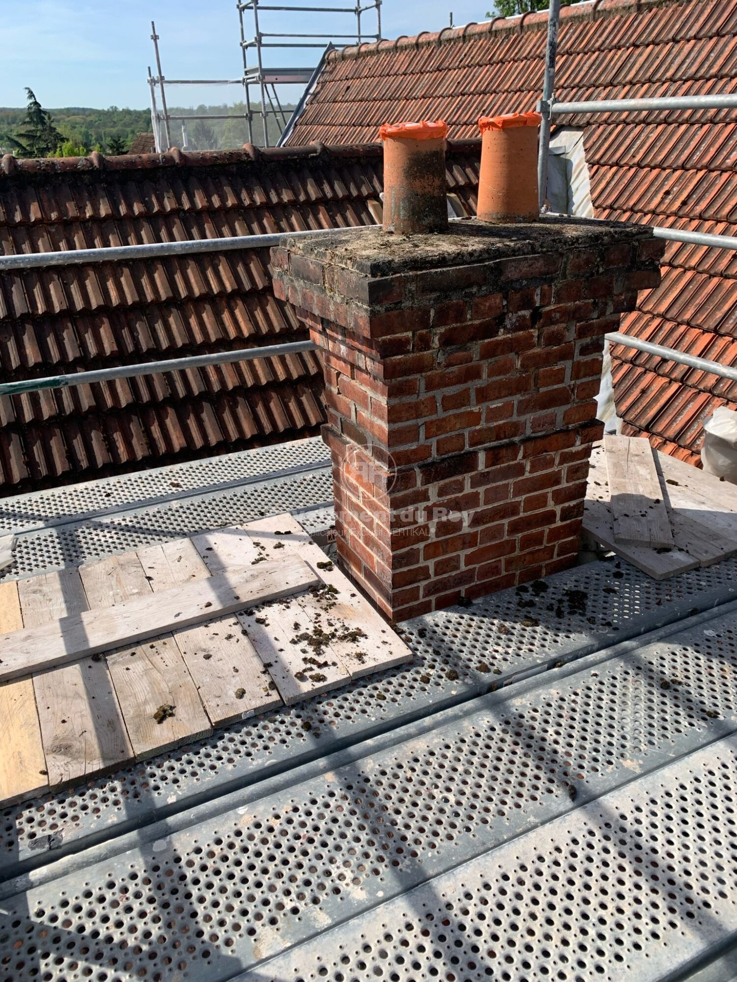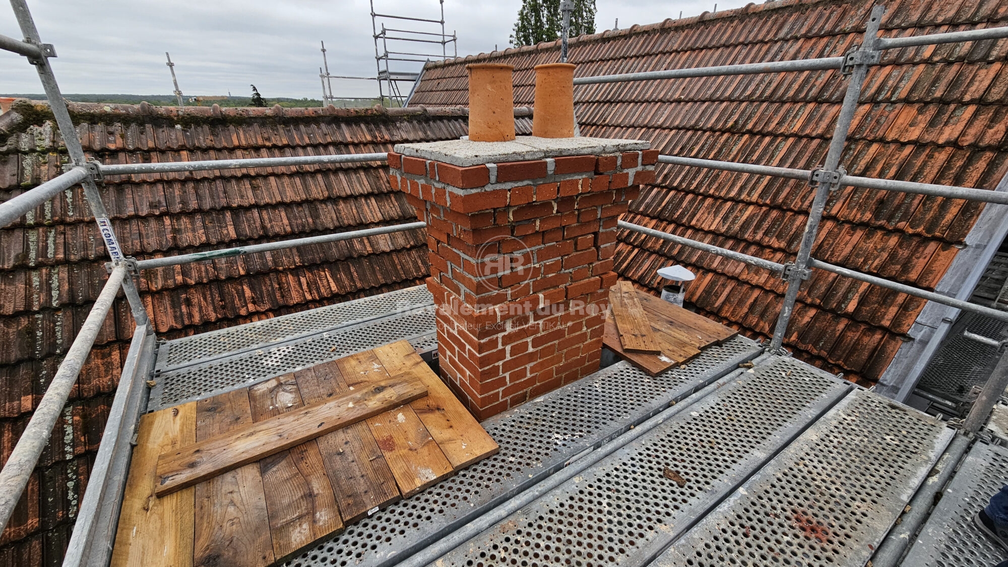 Une fois les façades nettoyées, un rejointoiement traditionnel à la chaux a été réalisé sur les zones concernées, notamment les souches de cheminées et les éléments en briques. Cette intervention manuelle a permis de redonner cohérence, relief et solidité aux maçonneries, tout en respectant le fonctionnement hygrométrique du bâti ancien.