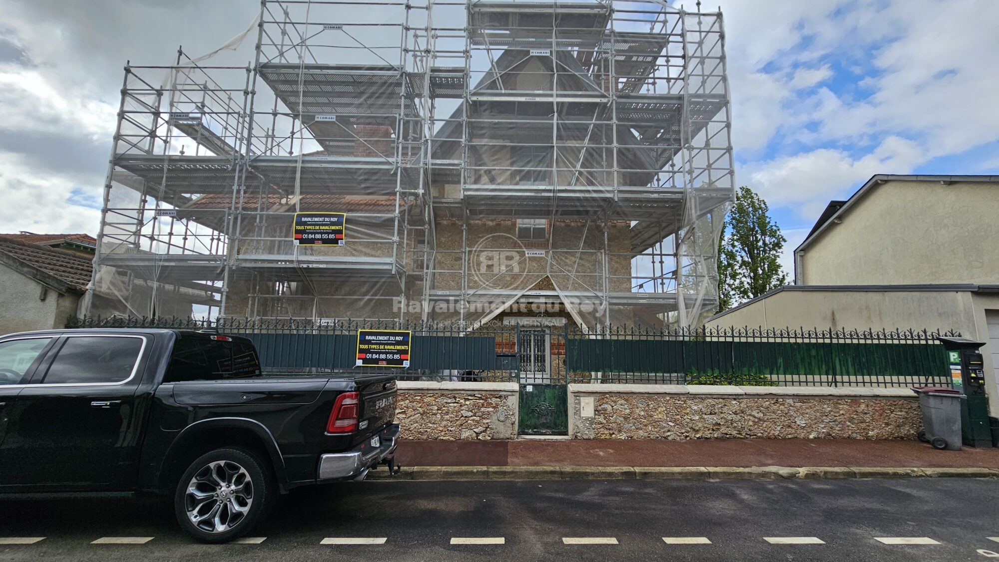 Le gommage permet un nettoyage en profondeur par projection douce, sans eau et à basse pression, respectant ainsi la matière d’origine. Cette méthode est particulièrement indiquée pour les façades en meulière, dont la surface irrégulière et poreuse nécessite une intervention maîtrisée. L’ensemble des façades a été sécurisé par un échafaudage professionnel équipé de filets, garantissant la sécurité du chantier et la protection de l’environnement immédiat.