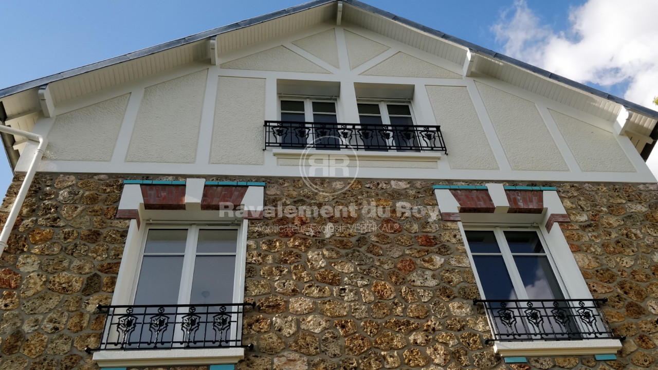 Pour compléter la rénovation, nous avons également pris soin de peindre quelques briques en linteau en utilisant une peinture bi-composants spéciale, qui permet de reproduire l’aspect des décors en céramique que l’on trouve fréquemment sur les maisons en meulières. Cette opération permet de souligner l’authenticité de la façade tout en lui donnant un aspect esthétique unique.