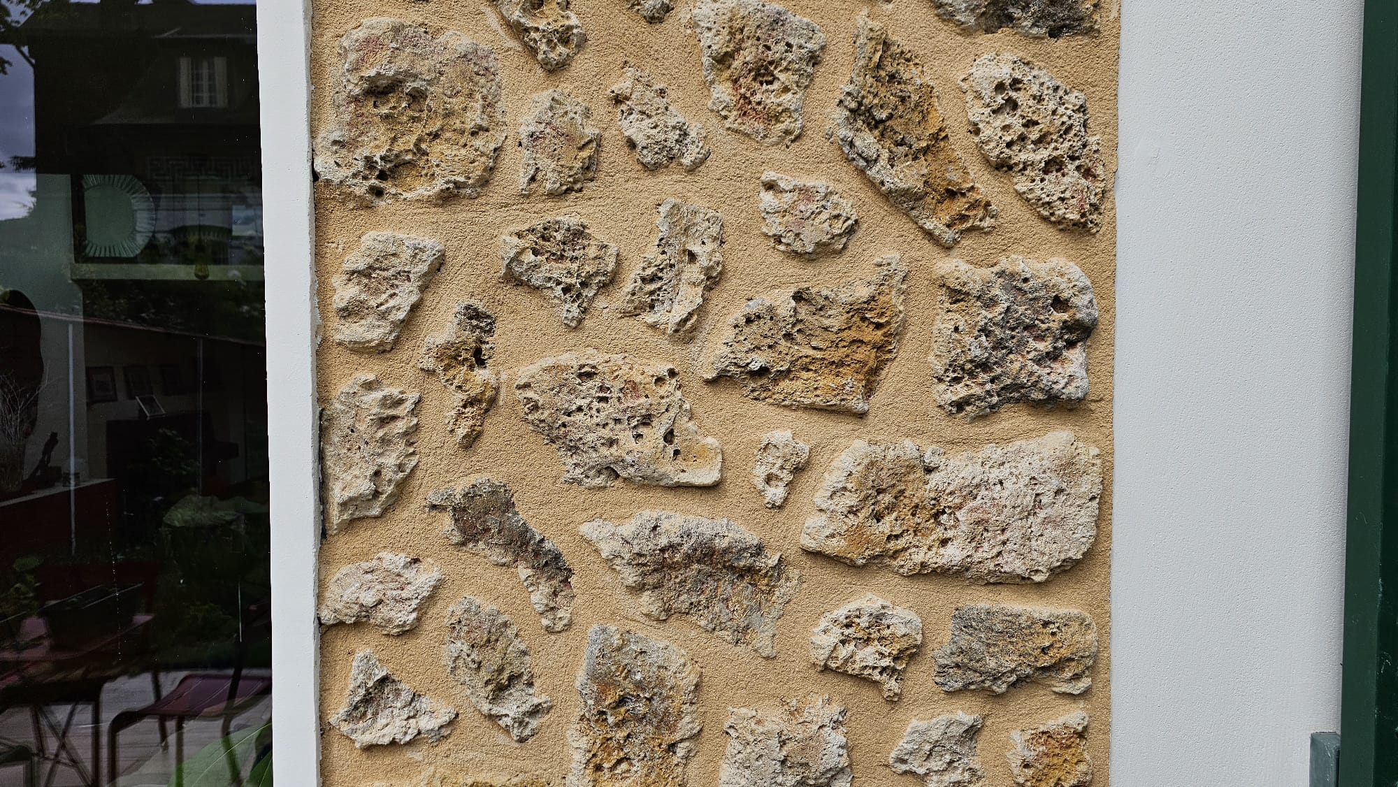 Un parement en pierre meulière sélectionnée pour son aspect moellon caverneux et sa patine naturelle a ensuite été mis en œuvre. Chaque élément a fait l’objet d’un calepinage précis, en croisant les joints et en évitant tout alignement vertical, afin de reproduire l’aspect irrégulier et naturel des façades anciennes. Les angles ont été traités spécifiquement pour conserver une cohérence visuelle et un relief authentique.
