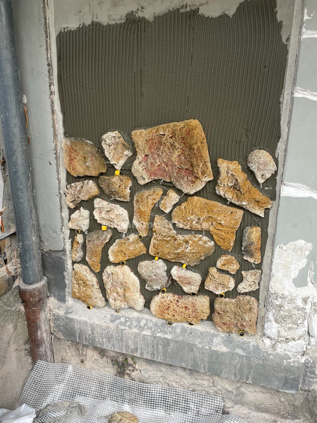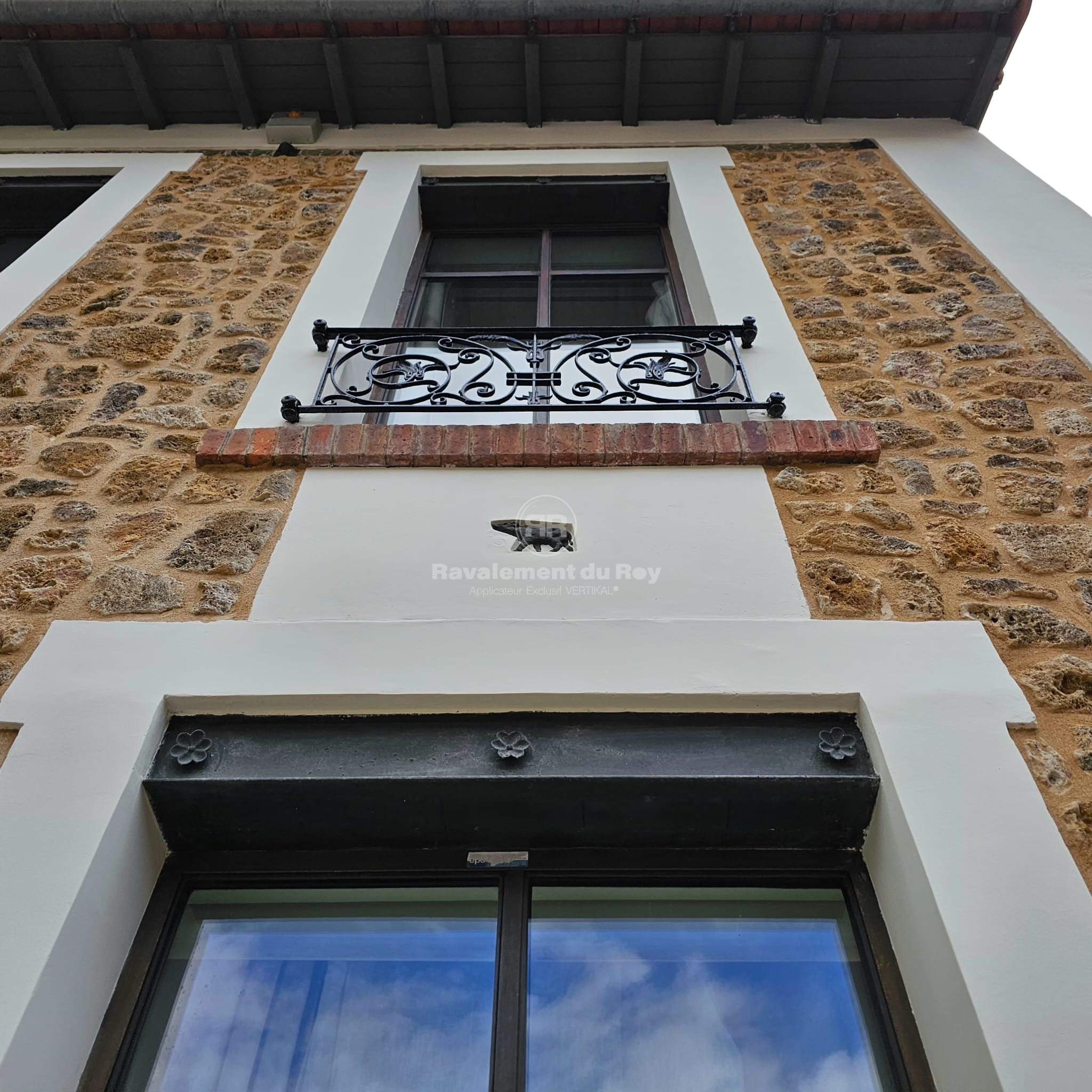 Les éléments métalliques ont été repeints avec une finition noire, créant un contraste élégant avec la façade minérale. L’ensemble des surfaces, pierre comprise, a été protégé par un hydrofuge incolore, prolongeant la durabilité des matériaux tout en conservant leur aspect d’origine.