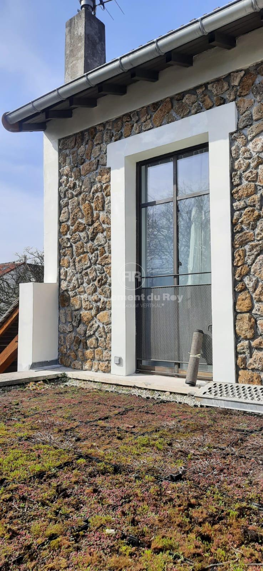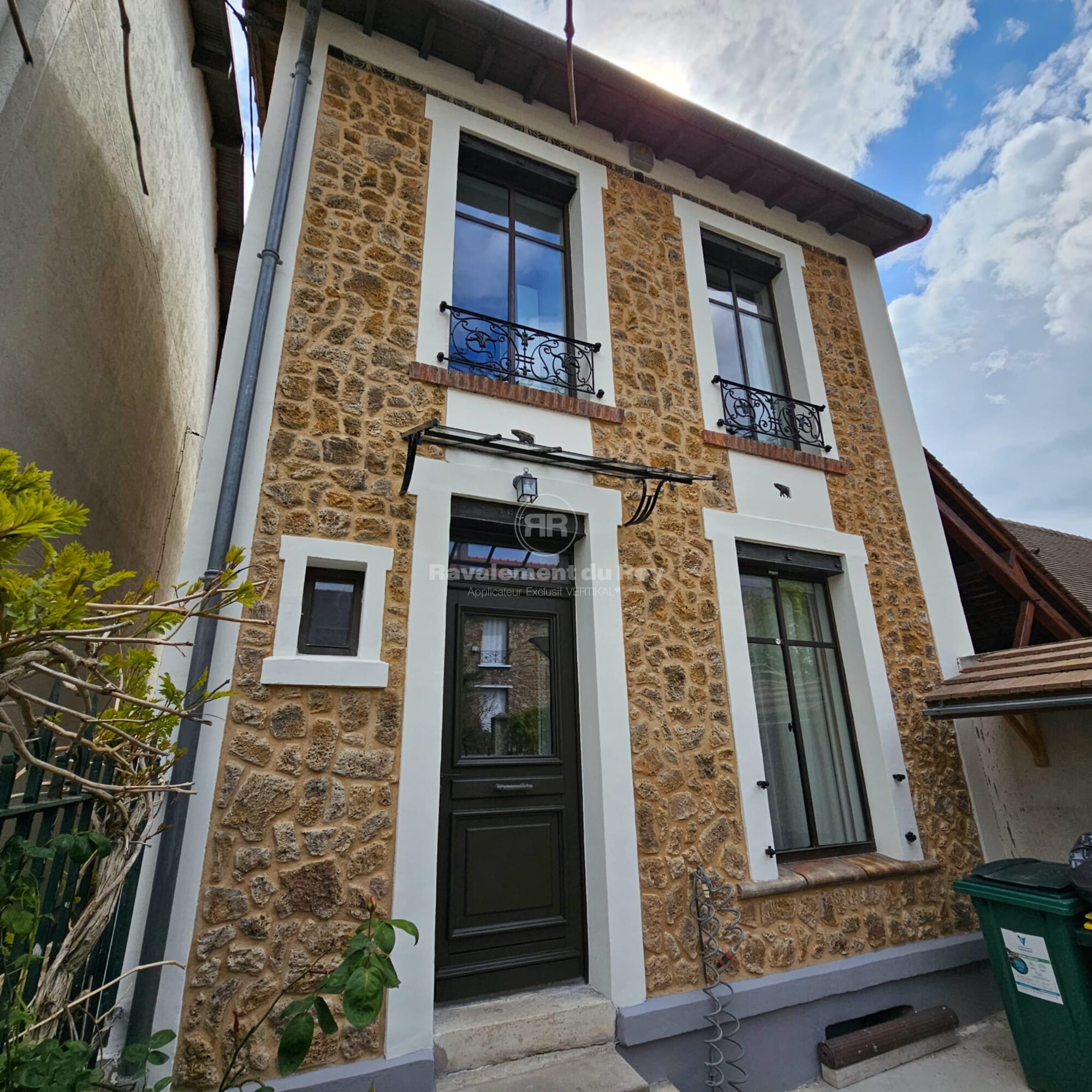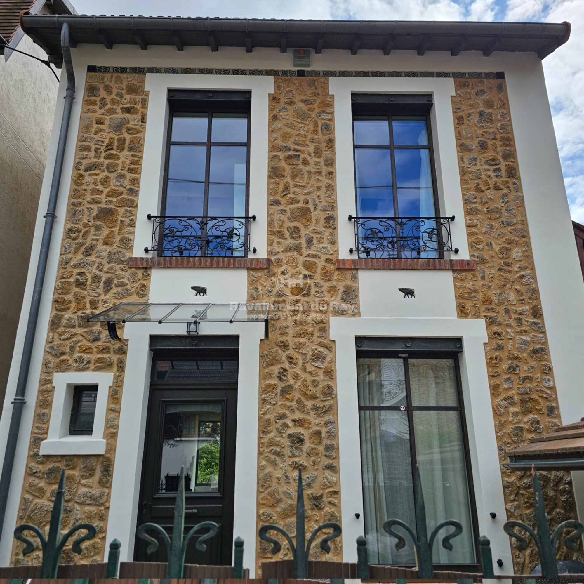 Les modénatures, encadrements de fenêtres et éléments décoratifs ont été traités avec VERTIKAL MINERAL, un revêtement minéral microporeux offrant un rendu mat, naturel et parfaitement compatible avec le parement en pierre meulière. Sa teinte Blanc Cassé apporte de la luminosité tout en mettant en valeur les pierres.