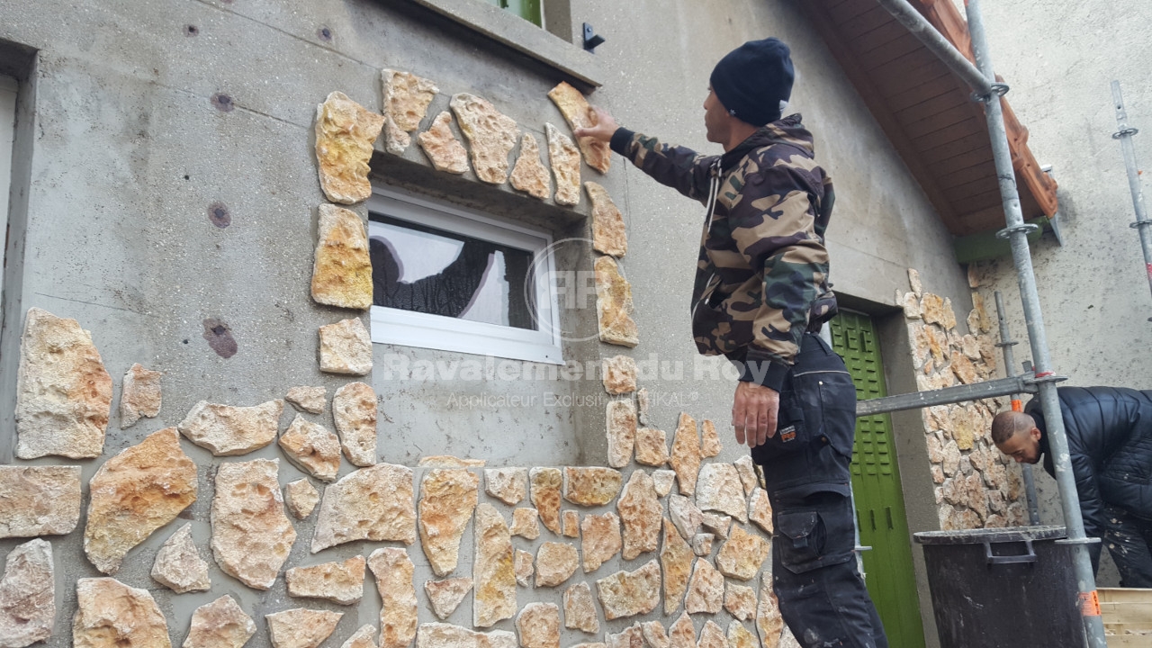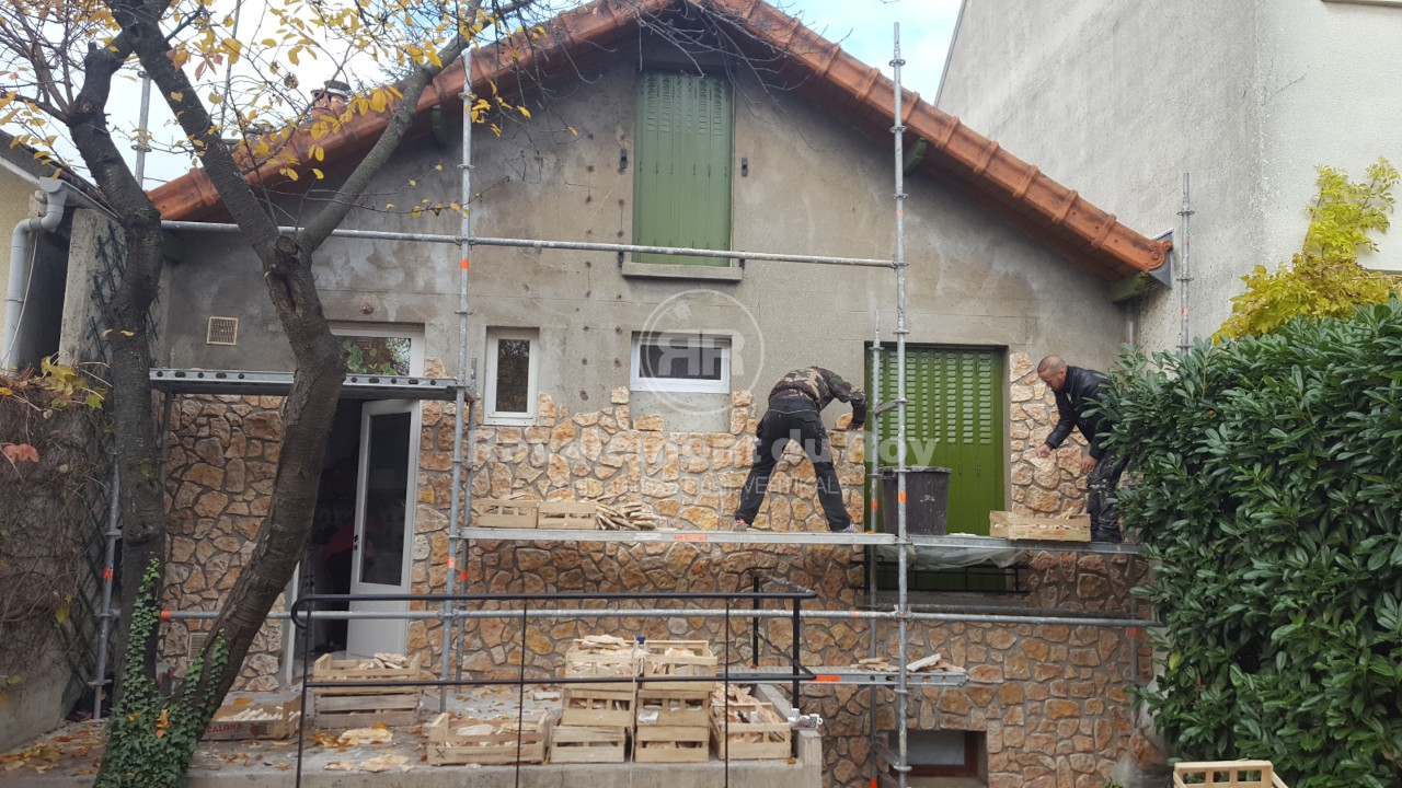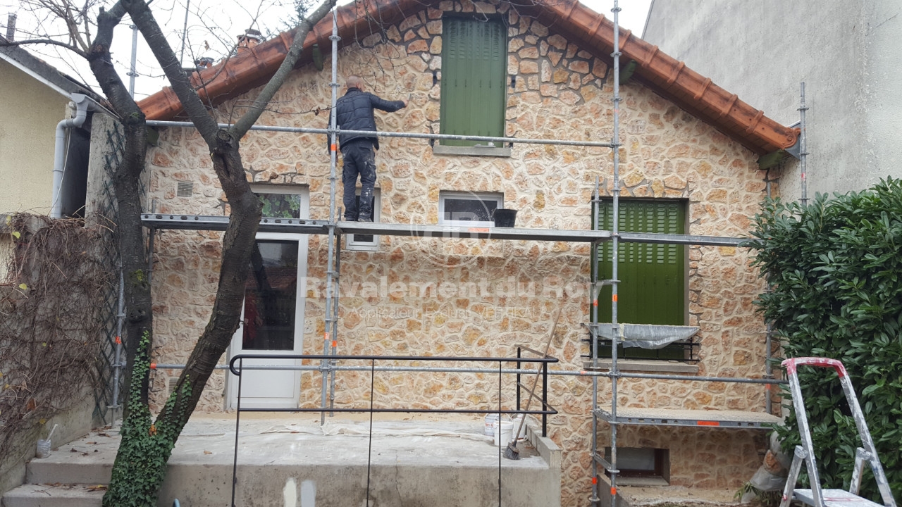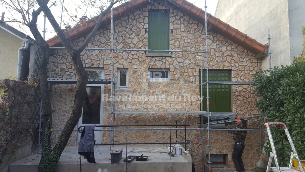 La façade côté jardin était recouverte de vigne vierge. Après élagage, nous avons procédé à un nettoyage en profondeur de la façade. Nous avons encollé les pierres de parement de meulière une par une et les avons placées sur la façade. La deuxième étape a été de rejointoyer l’ensemble par l’utilisation d’un enduit à la chaux aérienne, finition brossée.