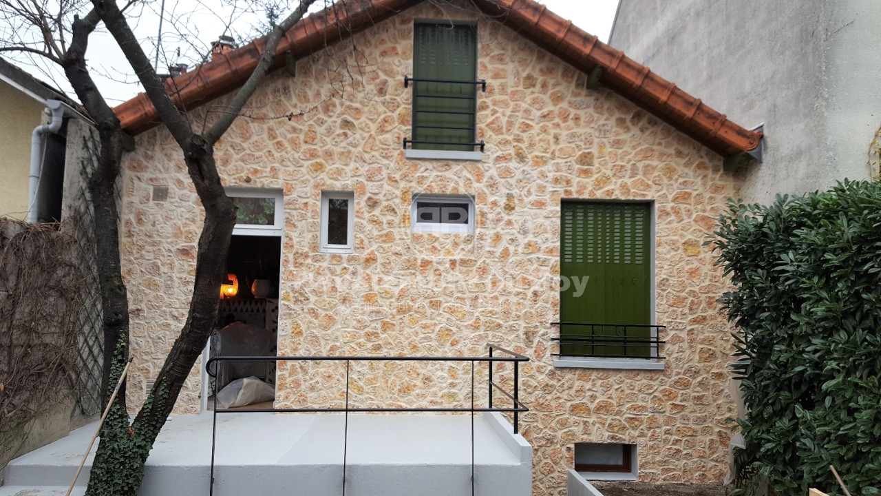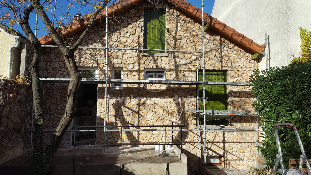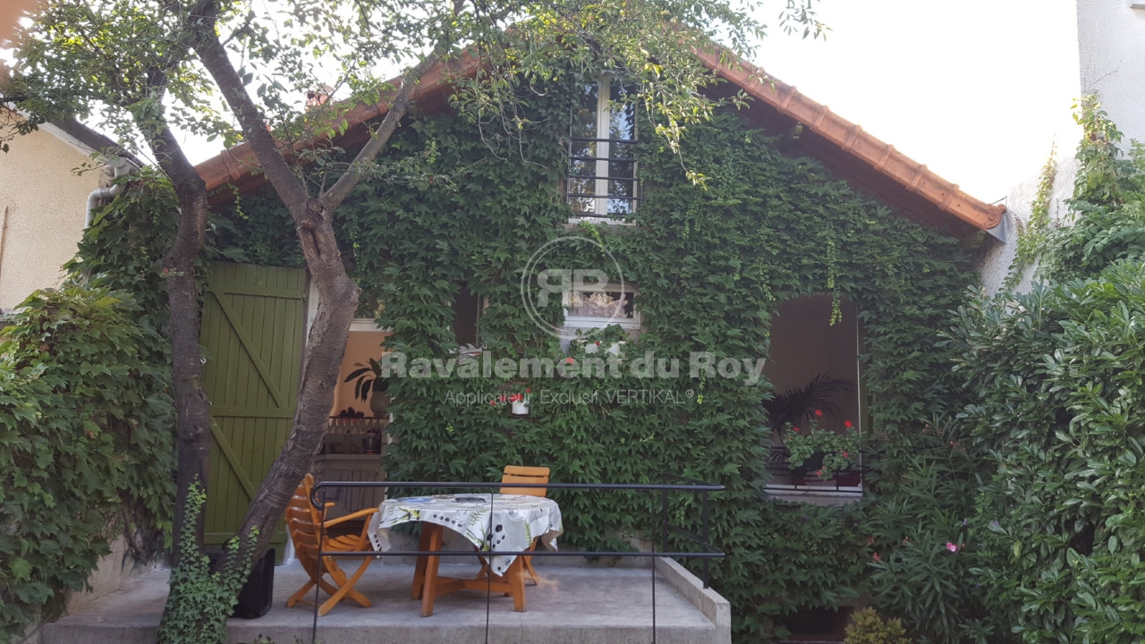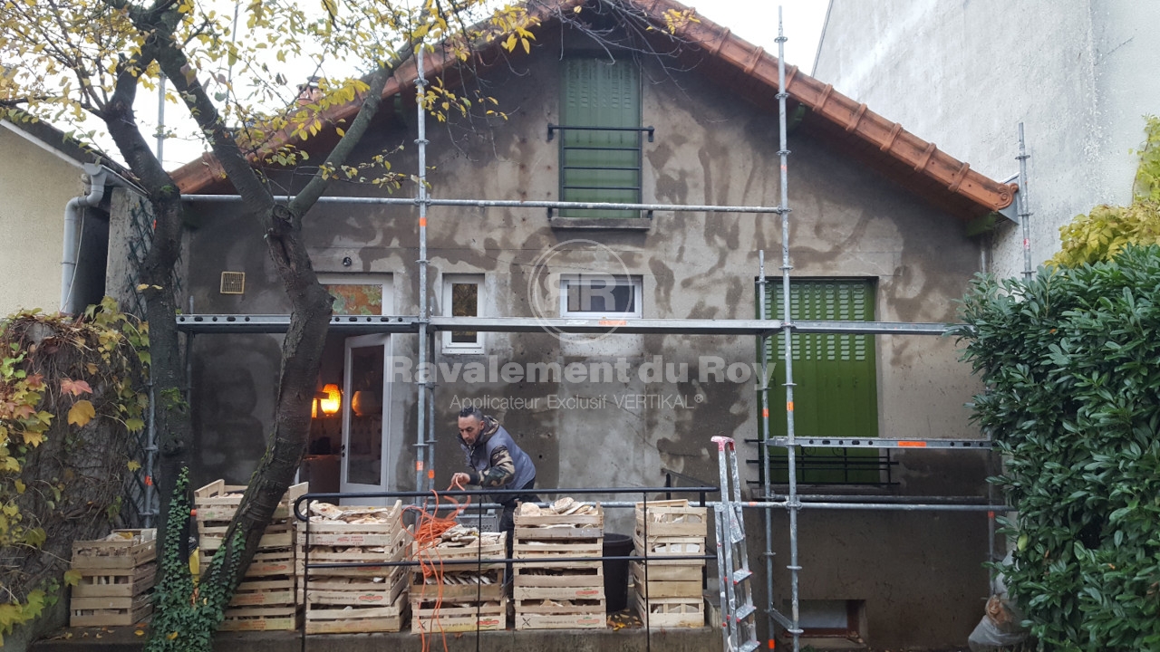 La façade côté jardin était recouverte de vigne vierge. Après élagage, nous avons procédé à un nettoyage en profondeur de la façade. Nous avons encollé les pierres de parement de meulière une par une et les avons placées sur la façade. La deuxième étape a été de rejointoyer l’ensemble par l’utilisation d’un enduit à la chaux aérienne, finition brossée.