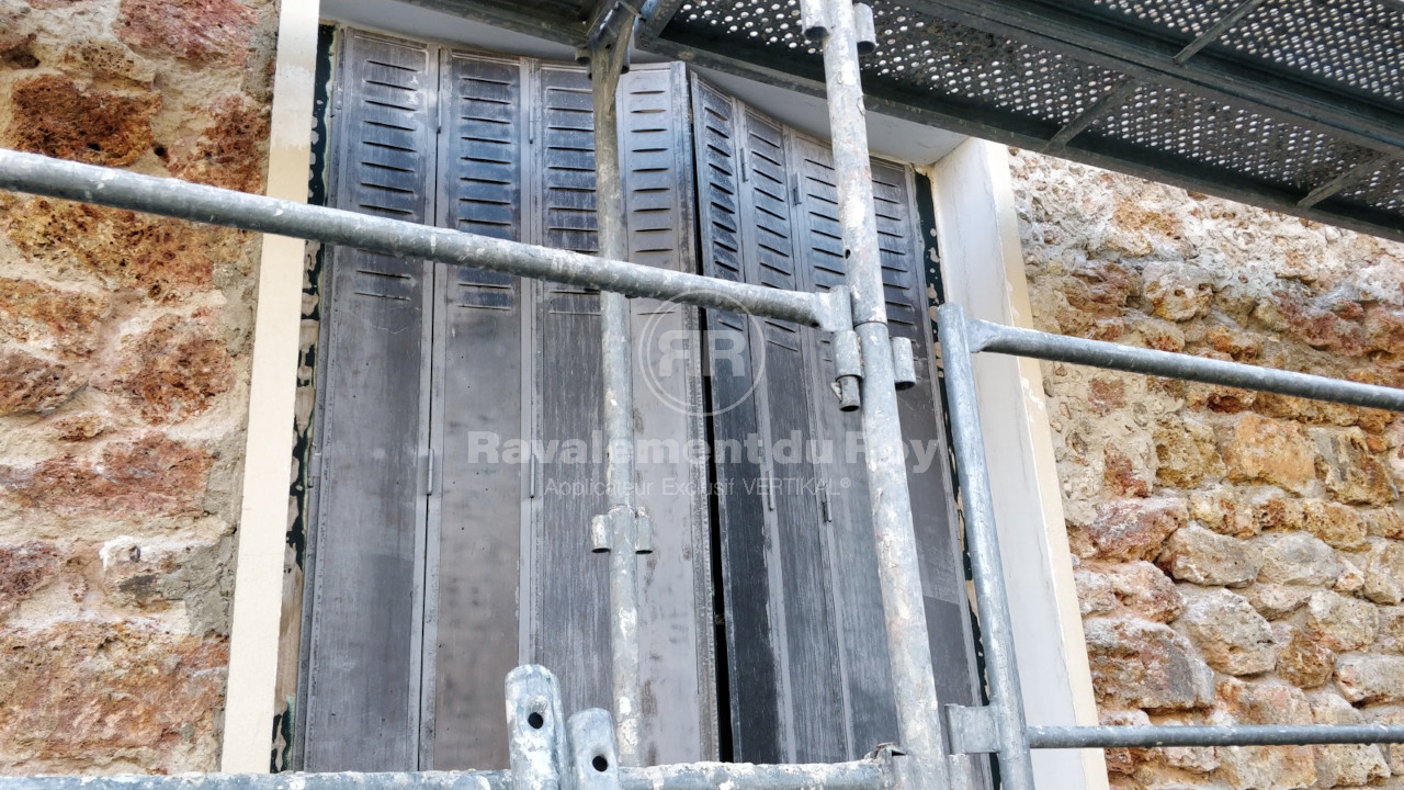 Nous avons entrepris un rejointoiement par rocaillage ; cette étape était primordiale dans notre travail de restauration. Cette technique traditionnelle consiste à incruster de petites pierres à cœur de joint pour conserver la beauté des façades. À l’origine, cette technique était utilisée pour apporter un côté cossu ou bourgeois à la maison. Bien qu’il s’agisse d’une tâche complexe et très chronophage, nous devions respecter le style de la maison et réussir un ravalement « à l’identique ».