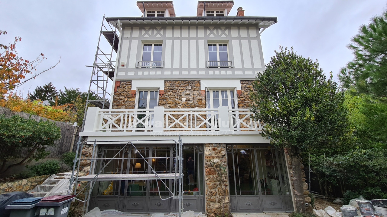 Souhait émis par le client : Le client souhaitait redonner vie à sa belle maison à colombages située à Saint-Cloud, en peignant les colombages et en protégeant la meulière grâce à un traitement hydrofuge.