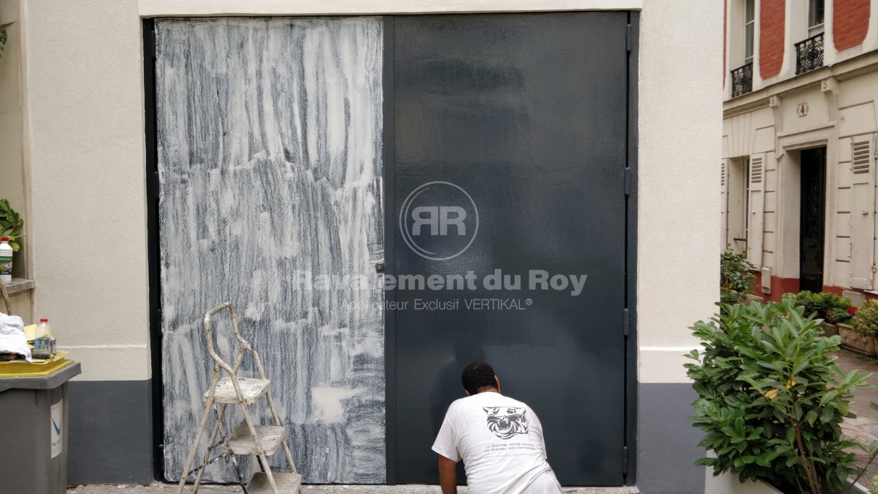 - Application du fixateur VERTIKAL CT : Ce produit sert à fixer le support et à garantir une bonne adhérence du revêtement de finition. Nous avons donc appliqué ce fixateur sur l’ensemble des surfaces préparées.