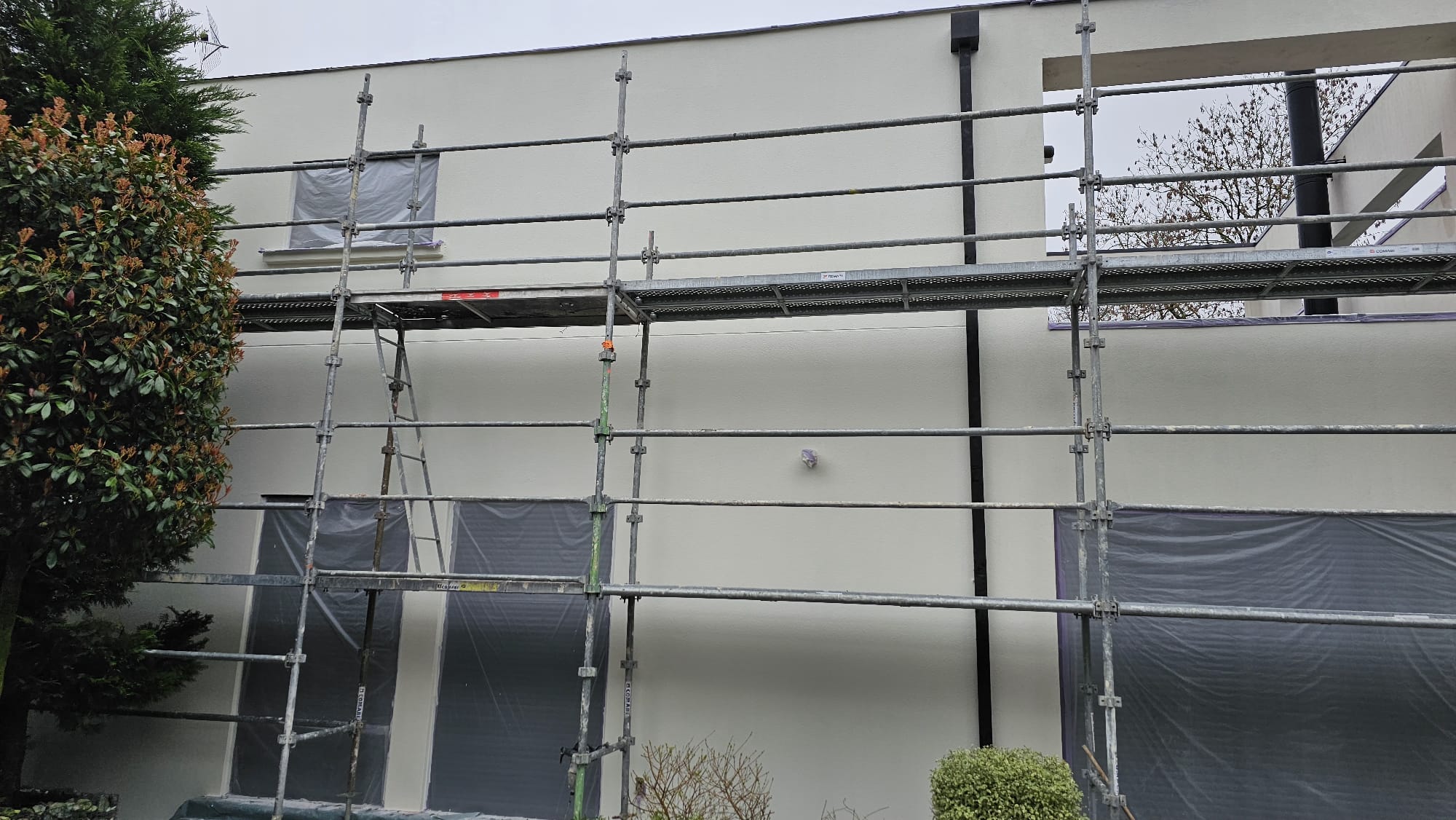 Située à Meudon, cette maison d’architecte se distingue par ses lignes contemporaines et ses volumes géométriques affirmés. Le propriétaire souhaitait engager un ravalement de façade afin de protéger durablement les murs tout en renforçant l’esthétique moderne de l’habitation. Quelques fissures étaient apparues sur le crépi et nécessitaient un traitement adapté. L’enjeu principal était de conserver l’esprit architectural de la maison tout en mettant en valeur ses volumes par une finition sobre, élégante et durable, associant deux teintes contrastées.