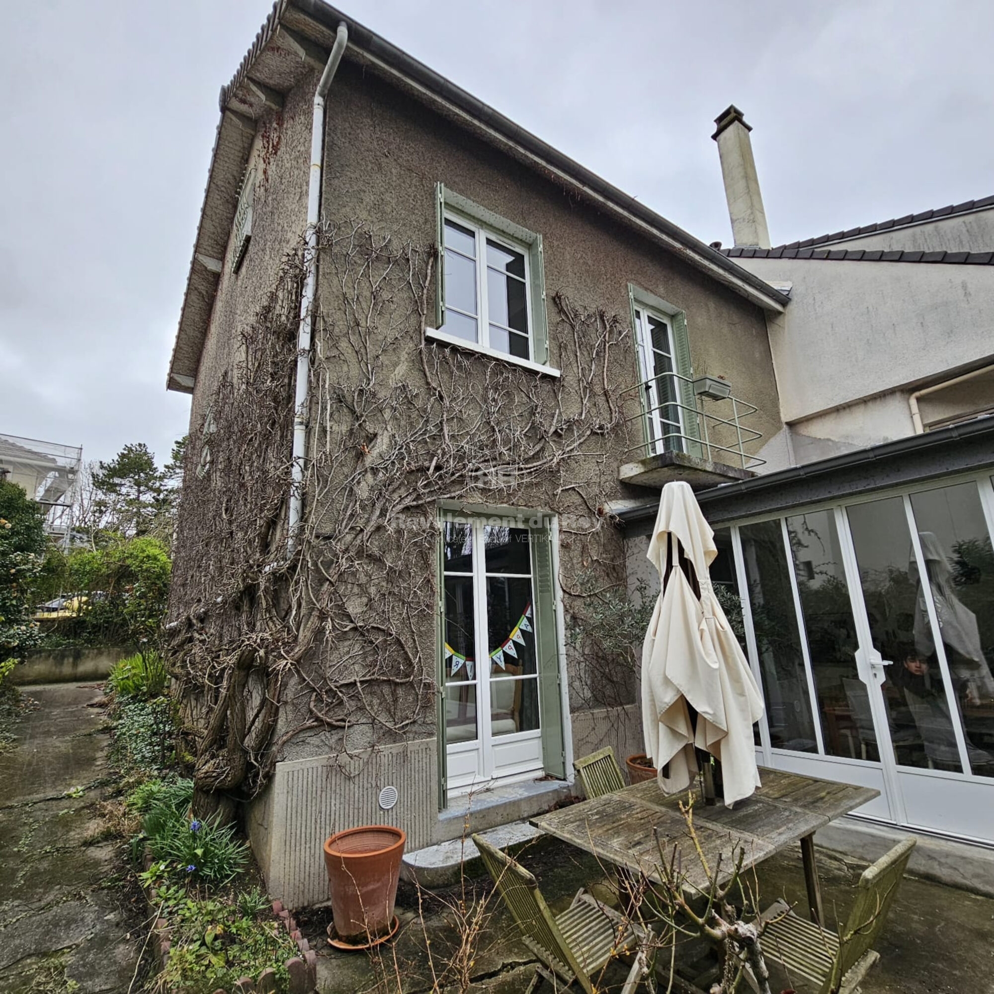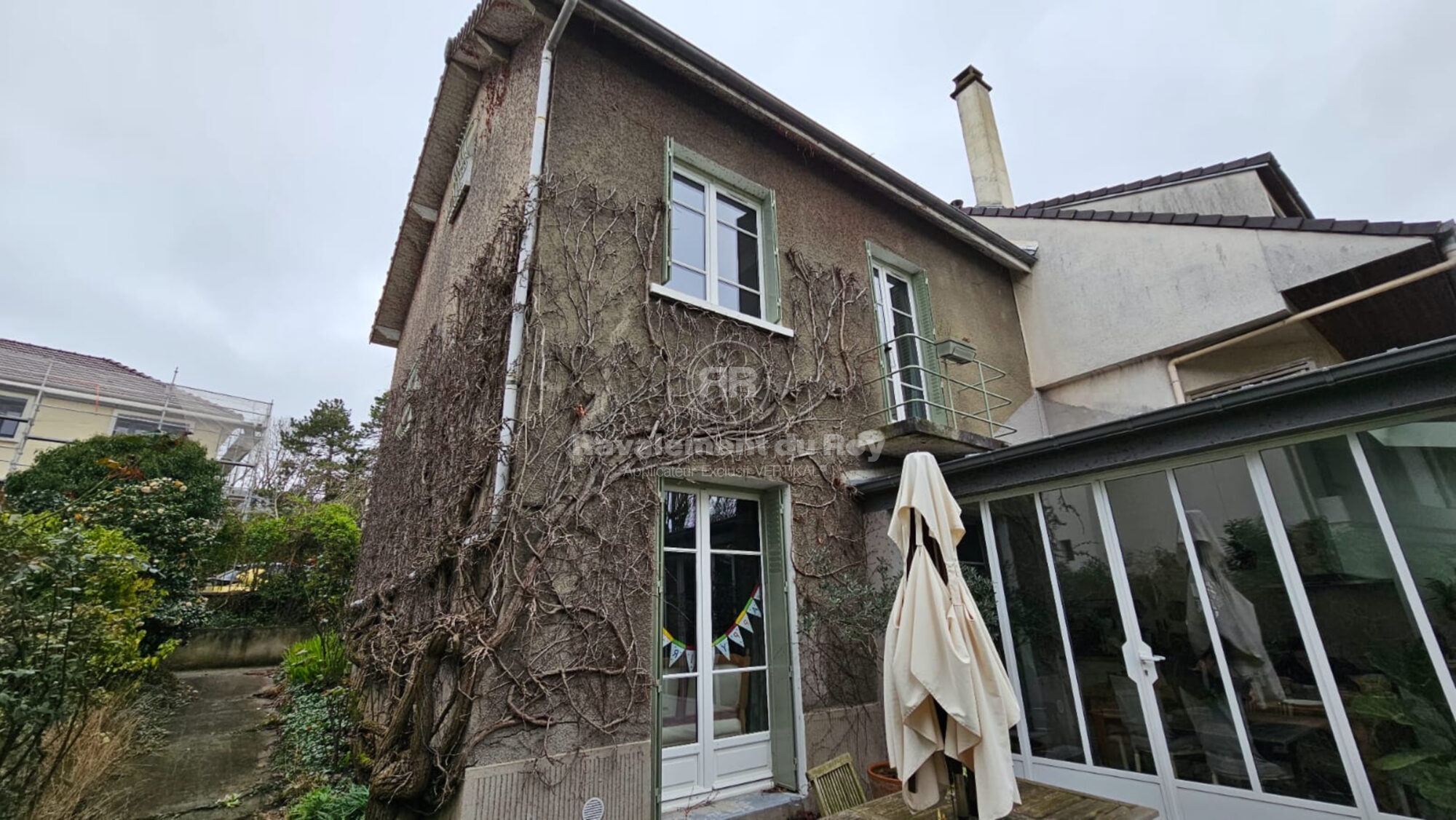 Les façades de cette maison située à Sceaux étaient fortement marquées par le temps. Le crépi projeté d’origine, recouvert de végétation dense, donnait un aspect hétérogène et vieillissant à l’ensemble. Le client souhaitait avant tout assainir les façades, supprimer toute trace végétale et moderniser radicalement le rendu extérieur.