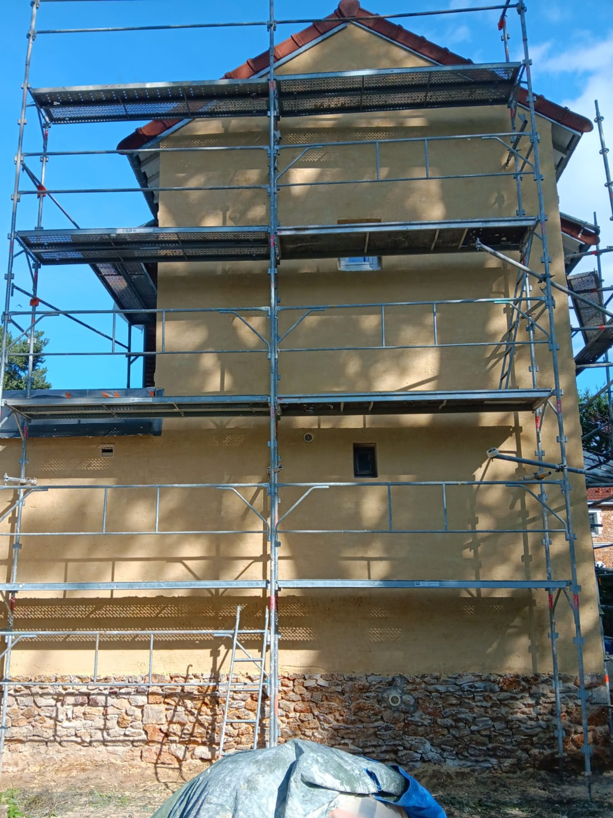 L’ensemble du pignon a ensuite été recouvert d’une peinture minérale VERTIKAL MINERAL en teinte Pierre. Son aspect mat et sa compatibilité avec les supports minéraux en font une solution idéale pour ce type de façade. En parallèle, les soubassements en pierre meulière ont été entièrement rejointoyés : chaque pierre a été nettoyée individuellement afin de restaurer l’aspect d’origine et d’assurer une protection durable contre l’humidité.