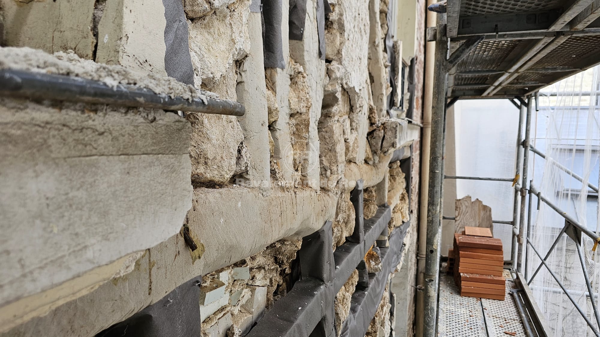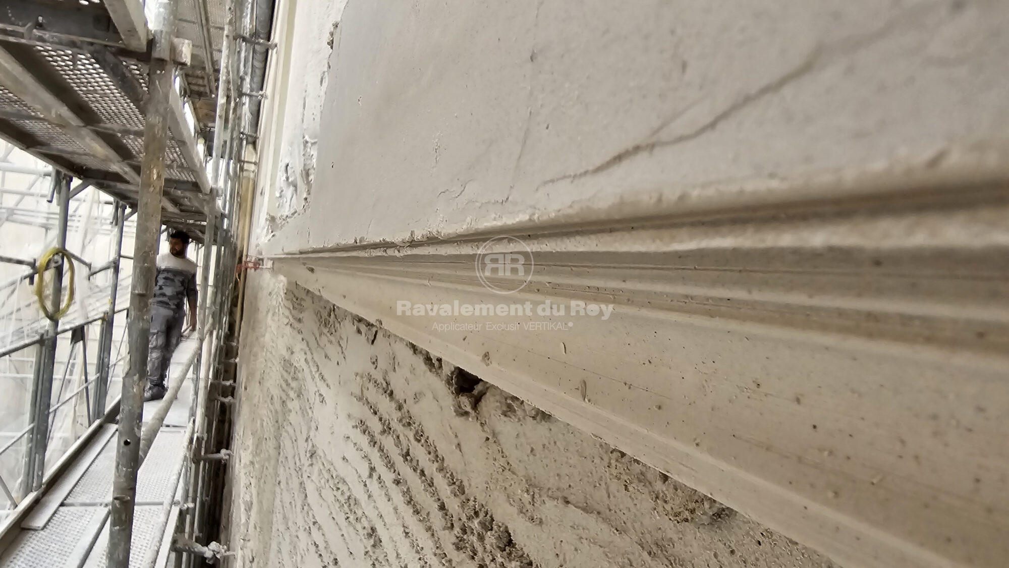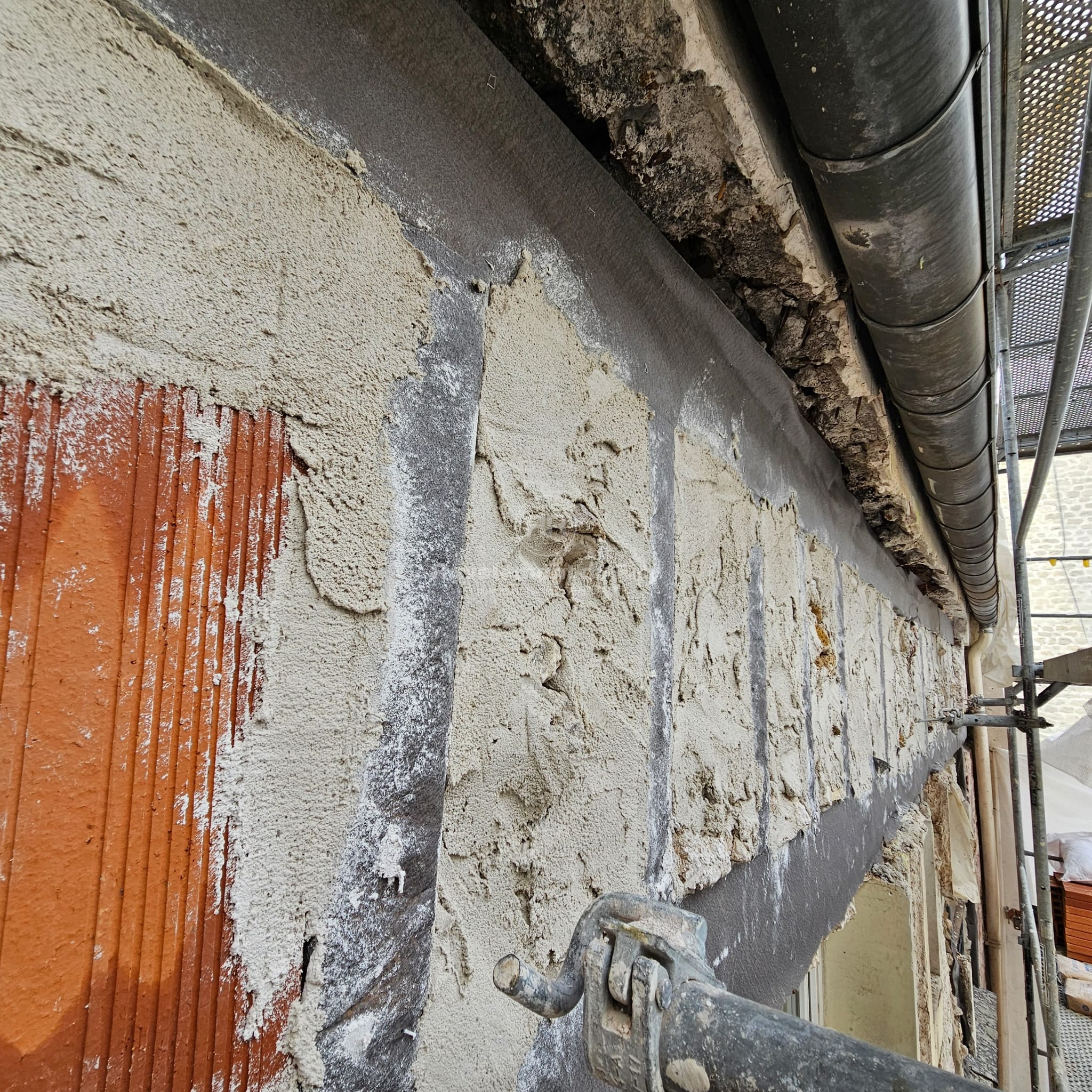 Les éléments décoratifs existants, tels que bandeaux, corniches et modénatures, ont été soigneusement reconstitués après dépose. Une attention particulière a été portée à la gestion des évacuations d’eau et aux points singuliers afin d’éviter toute infiltration future. L’ensemble de la façade a ensuite été repris manuellement à l’aide d’un micro-mortier de chaux, permettant de restaurer la cohésion des supports, leur respirabilité et un rendu esthétique fidèle au bâti ancien.