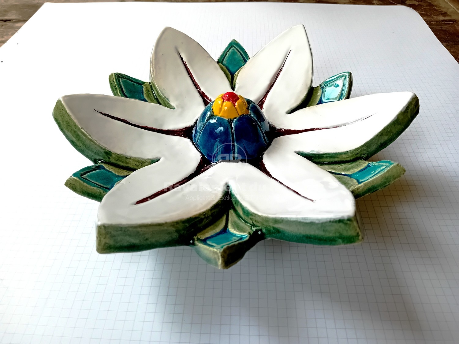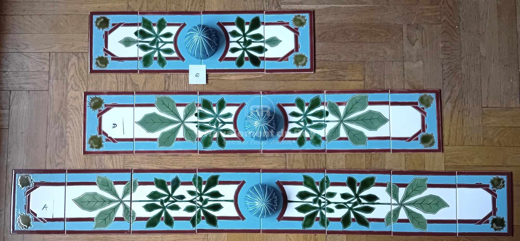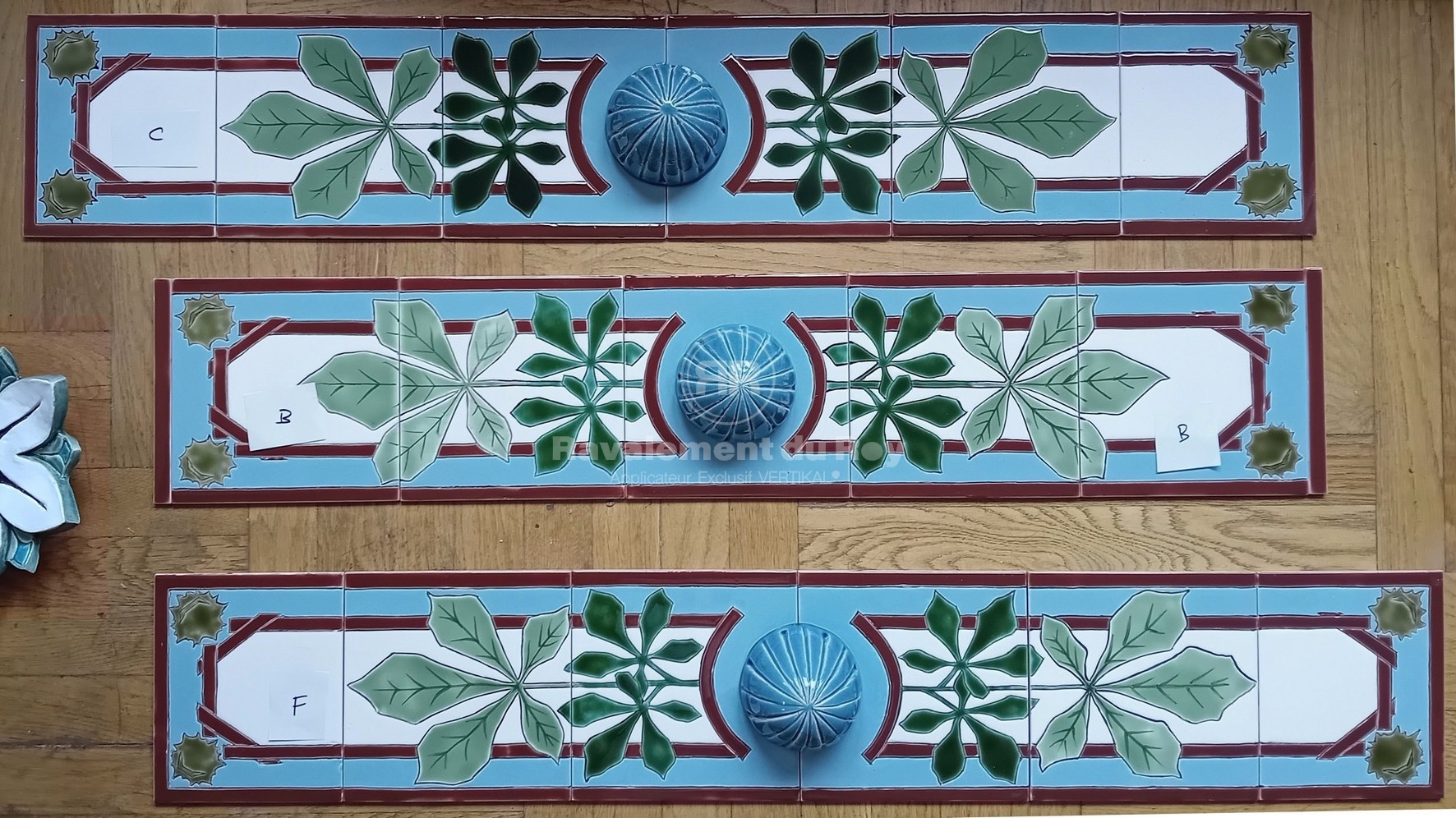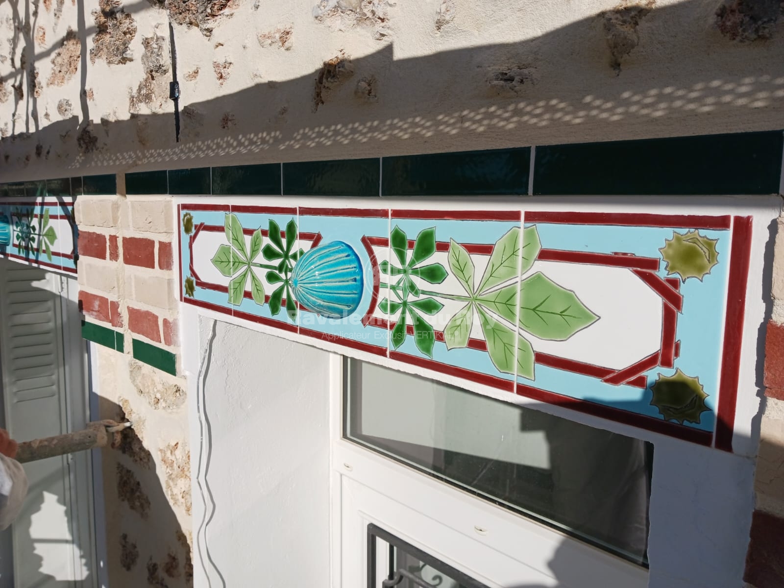 Afin de créer un point focal autour des baies vitrées, nous avons proposé l’intégration de frises décoratives en céramique émaillée. Ces pièces uniques, réalisées à la main par une artiste lyonnaise, s’inscrivent dans un esprit art déco raffiné. Le projet a notamment intégré une frise « presse-citron », des cabochons verts et un grand nénuphar émaillé. Leur pose a nécessité une préparation précise des supports et une mise en œuvre minutieuse.