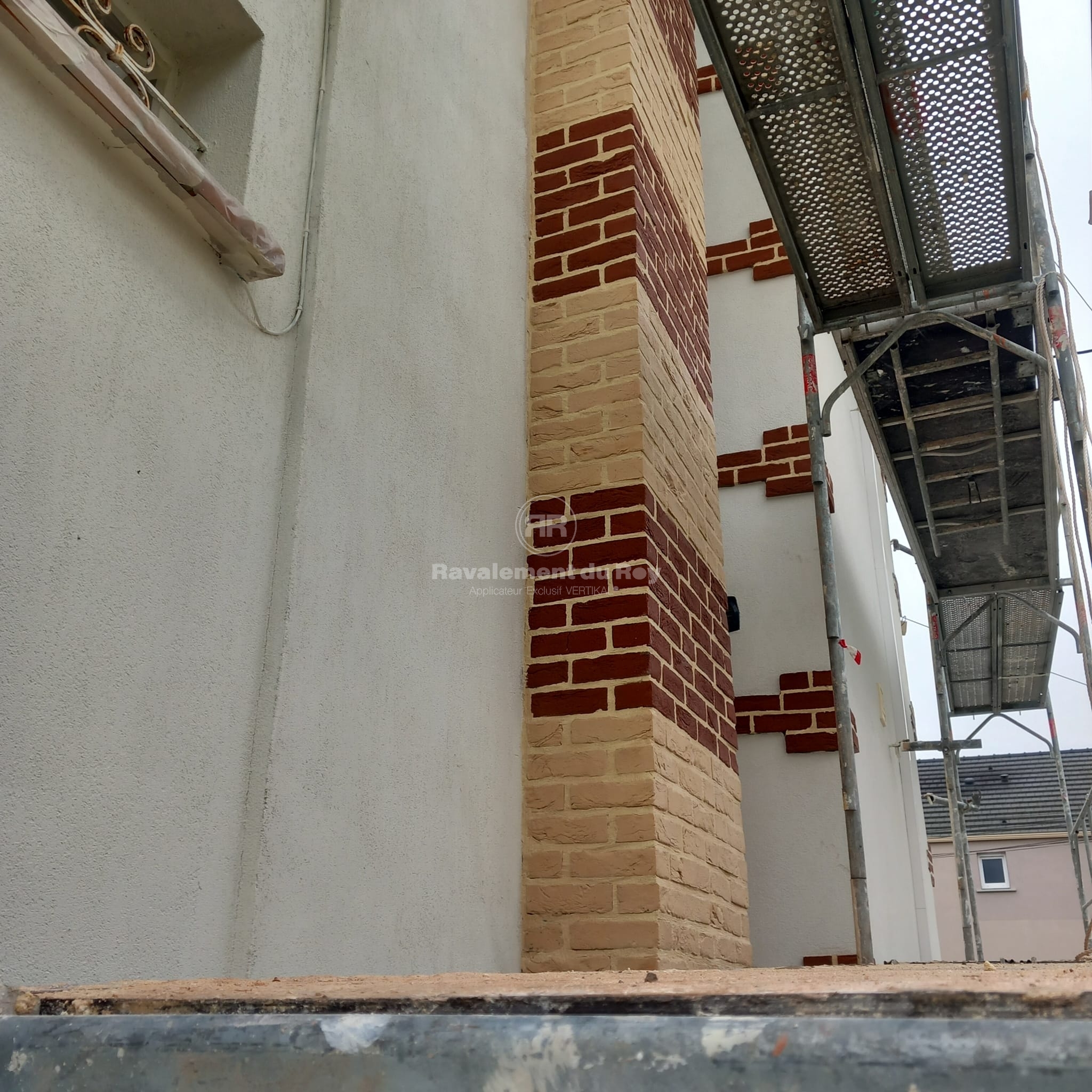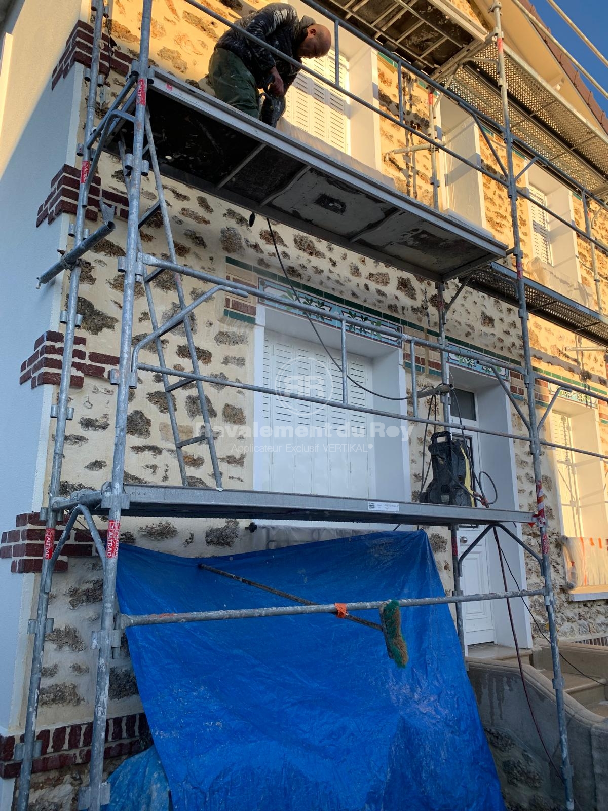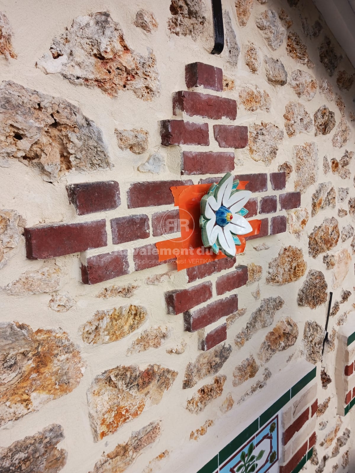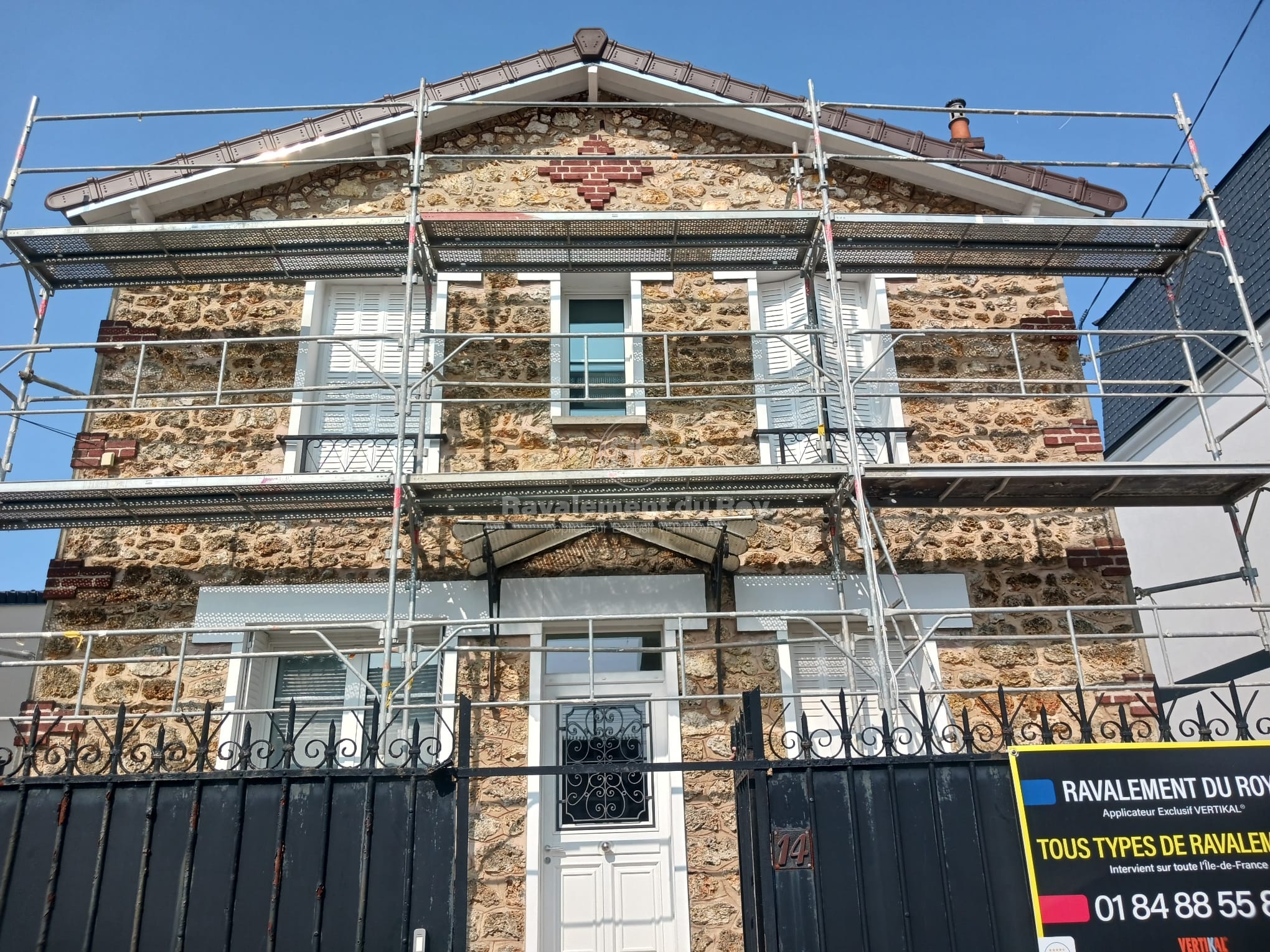 Sur la meulière et les briques de parement, un traitement VERTIKAL HYDROFUGE a été appliqué. Ce produit incolore pénètre en profondeur dans le matériau et empêche durablement l’humidité et les salissures de s’infiltrer. Il préserve l’aspect naturel de la pierre et des briques tout en renforçant leur résistance aux agressions climatiques. L’application en pulvérisation jusqu’au refus garantit une imprégnation complète et une efficacité maximale.