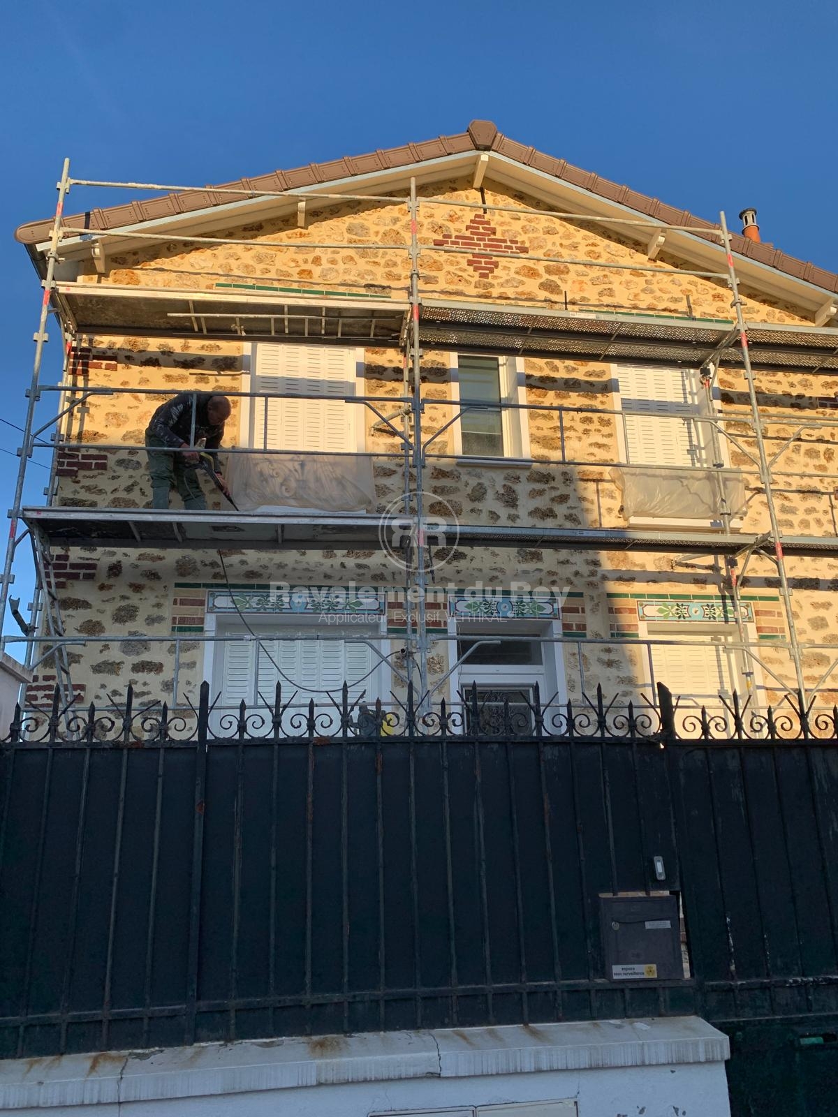 Située à Bourg-la-Reine, cette maison présentait une façade principale en pierre meulière fortement marquée par le temps. Le propriétaire souhaitait redonner de la lisibilité et du caractère à cette façade tout en valorisant son architecture existante. Son projet s’inscrivait dans une recherche d’élégance et d’authenticité, avec une inspiration art déco assumée mais maîtrisée. Il souhaitait intégrer des éléments décoratifs discrets autour des ouvertures, notamment des frises en céramique émaillée, tout en conservant une cohérence globale entre la meulière, les façades crépies et la cheminée. L’objectif était d’obtenir un rendu soigné, patrimonial et durable, fidèle à l’esprit local de Bourg-la-Reine.