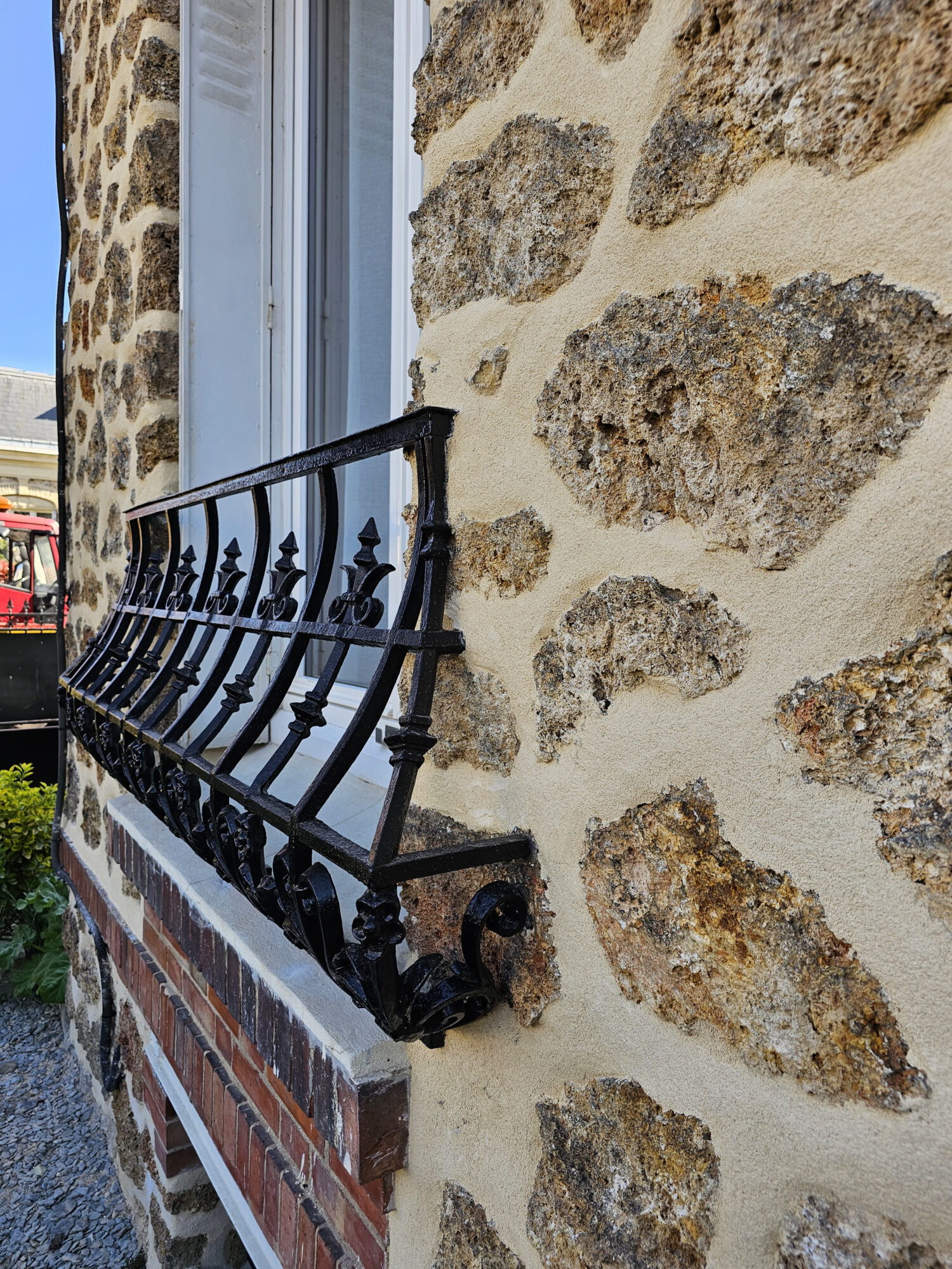 Les menuiseries bois ont été rénovées avec la peinture RECAWOOD, conçue pour l’extérieur et offrant une excellente tenue dans le temps. Les ferronneries ont été protégées à l’aide de la peinture antirouille ARUB, assurant résistance à la corrosion et finition soignée. L’ensemble des produits a été sélectionné pour sa compatibilité avec le bâti ancien et sa durabilité.