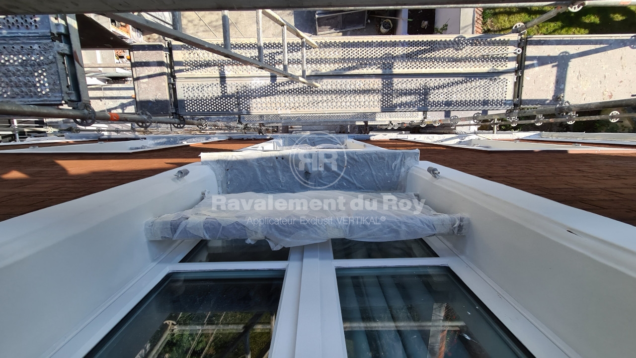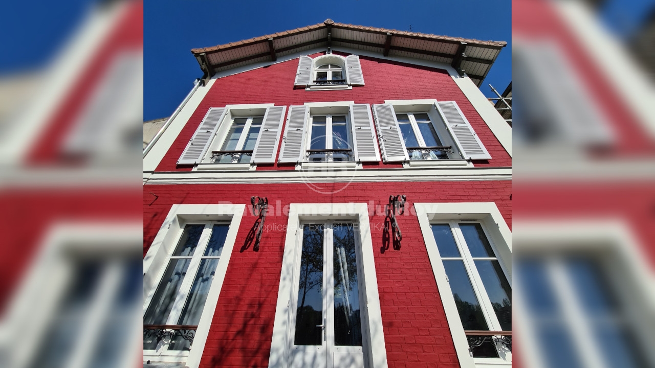 Nous avons d’abord inspecté les façades pour identifier les problèmes éventuels. Après avoir analysé les différents éléments, nous avons pris la décision de conserver les décors existants et avons opté pour l’application d’un revêtement de façade à base de résines acryliques sur les quatre façades extérieures. La peinture de façade VERTIKAL FM MAT a été préconisé pour ces travaux de ravalement car ce film mince à base de résine acrylique offre une grande résistance aux intempéries et aux rayons UV. Il permet également de réaliser des teintes soutenues, comme le rouge, ce qui a été très apprécié par les propriétaires. Les couleurs soutenues vieillissent bien mieux avec ce revêtement de finition dont les pigments résistent bien mieux aux U.V. que d’autres types de revêtements muraux.
